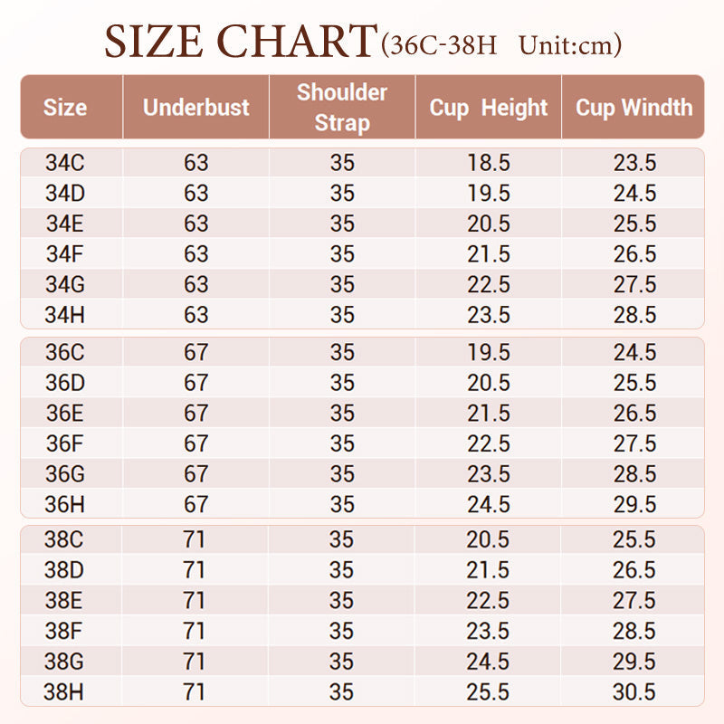 Size: 34C, 36C, 38C, 40C, 42C, 44C, 34D, 36D, 38D, 40D, 42D, 44D, 46D, 34DD, 36DD, 38DD, 40DD, 42DD, 44DD, 46DD, 34G, 36G, 38G, 40G, 42G, 44G, 34H, 36H, 38H, 40H, 42H, 44H, 46H